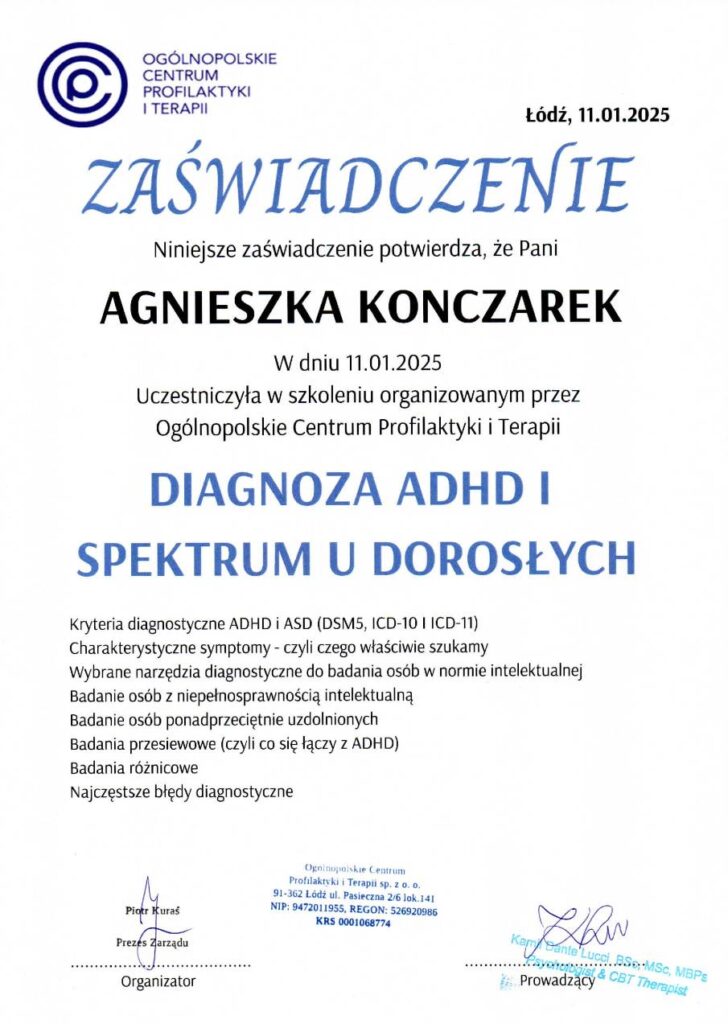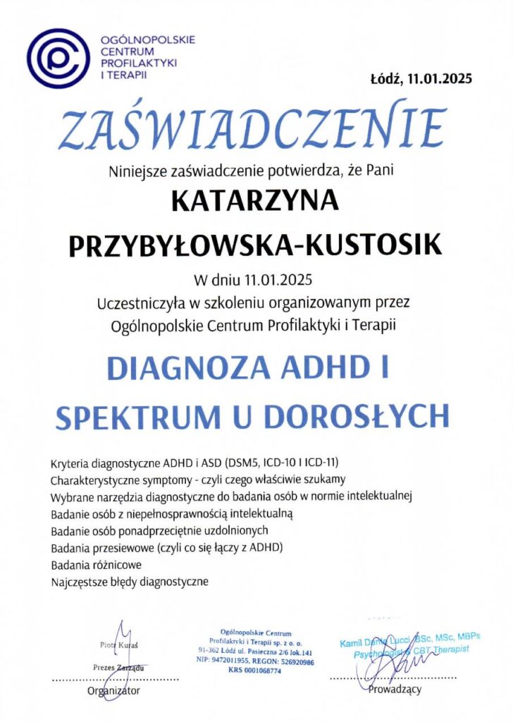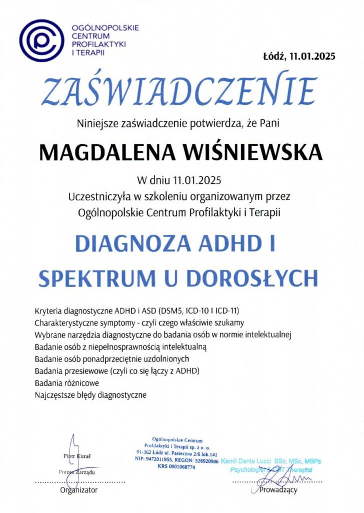 Diagnoza ADHD u dorosłych jest procesem złożonym, wymagającym współpracy lekarza psychiatry z psychologiem diagnostą. W Ogólnopolskim Centrum Profilaktyki i Terapii oferujemy kompleksową diagnozę opartą na: